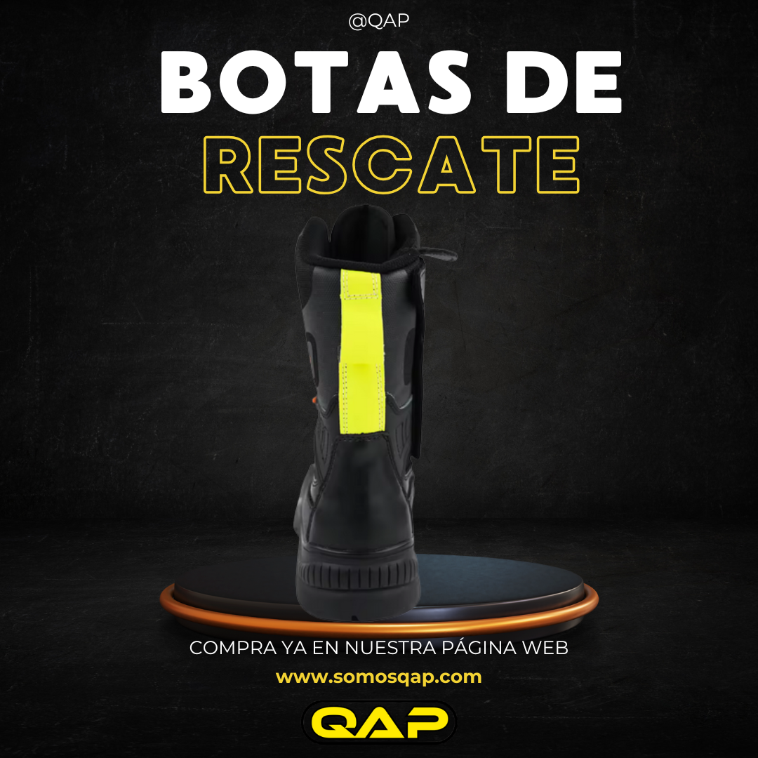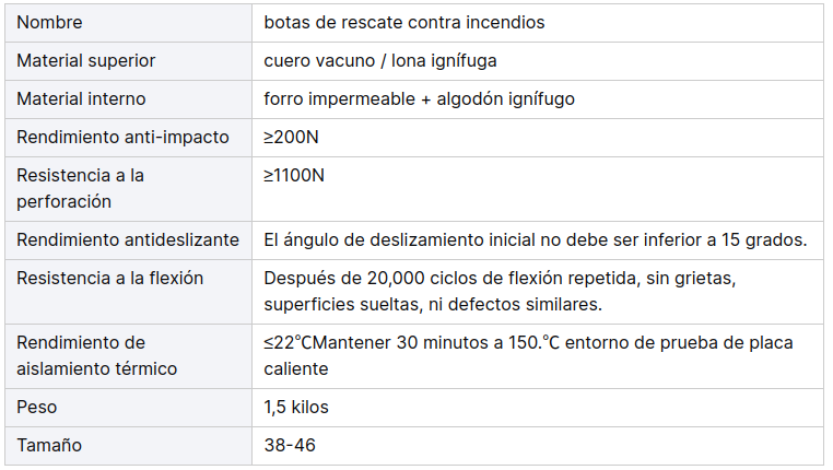 Piel de vaca + lona ignífuga + tira de advertencia + hebilla de zapato con polea + puntera de fibra de vidrio + entresuela de Kevlar + cordones ignífugos + forro impermeable + ventilación impermeable